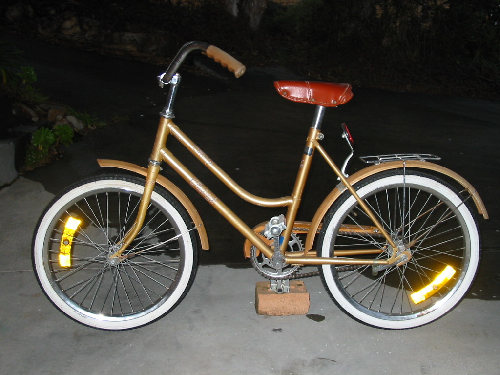 This will go to the happiest girl at the Sustainable Living Expo. It’s just a wonderful girls cruiser with whitewall 20″ tyres, comfortable riser bars, mudguards and rear rack. The old style single speed with back pedal brakes and chain guard makes this easy to ride and super low maintenance.
