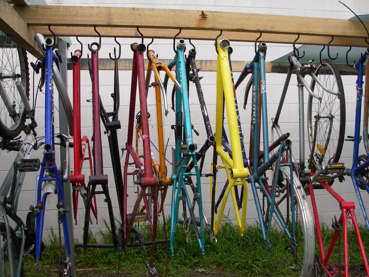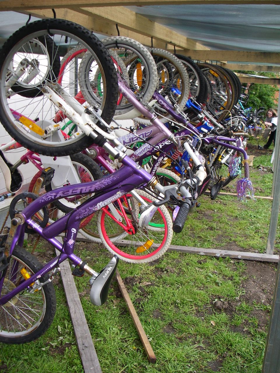 The planned configuration is to have kids bikes closest to the shed, and a dedicated bay at the far end for ‘project bikes’ – those that have tags on and have been worked on in past 3 weeks. We also have a heap of frames which we’ve hung quite closely in the middle section, in order to make best use of the space. Over next few weekends a few ‘cull or keep’ decisions will be made with regard to a heap of kids bikes and MTBs.